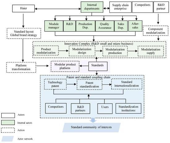 Interest connection mechanism serve to integrate actors by aligning their common goals into an overall solution. In this stage, relevant actors are connected to form the network focusing on the OPP of the standard complex. The standard complex is essentially a network composed by relevant actors that emerges from the coordination of technology standards and standards. Firstly, Haier leverages the internal market mechanism to connect various internal and external actors, which include R&D partnerships, competitors, users, and other actors, to form the innovation chain of “product modularization–modularization design–modularization production–modularization supply”. This forms an innovation complex that fosters collaborative innovation. Secondly, the roles of the actors are defined according to their positions in the patent and standard coupling chain of “technology patent–patent standardization–standard internationalization”. This results in the formation of a standard complex. Specifically, the roles of internal departments and supply chain companies are positioned in technology standards. “Haier helps suppliers in accelerating R&D, improving quality, reducing cost, and achieving efficiency” (C05). The user is positioned as the catalyst for technology standards, as “all innovations can only be kept alive by meeting the users’ needs” (C03). Competitors have dual roles in technology standards and standard formulation. “In some technology areas, we collaborate on R&D, jointly promote the formulation of standards; this can achieve a win–win” (C04). The standardization institutions are positioned as standard formulation supporters. With the support of the National Standardization Administration of the P.R.C. (SAC), Haier undertakes the secretariat work of National Technical Committee 46 (SAC/TC46). This promotes the translation of technical outcomes into relevant standards and regulates the development of the industry.