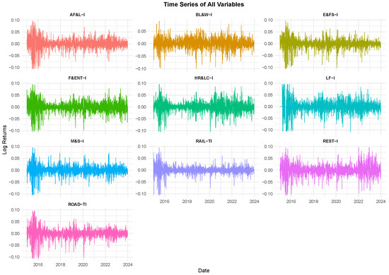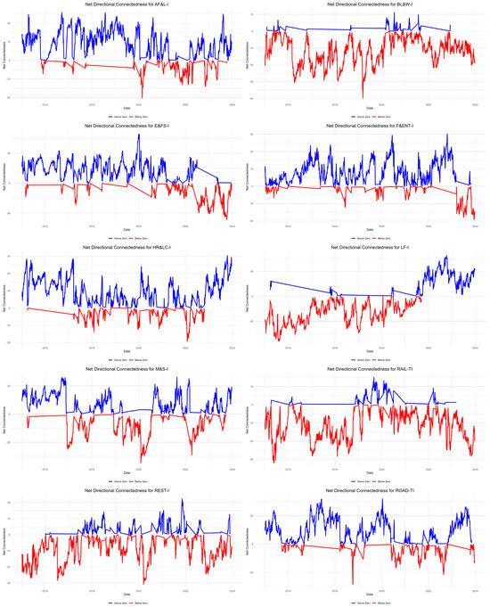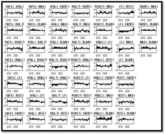 Figure 7 presents ten subplots demonstrating time-varying directional connectedness among the hospitality subsectors. We observe that during crisis events, risk transmission intensifies, particularly in travel-related industries, highlighting their vulnerability to external shocks. It displays the ten subplots which show the dynamics and directional connectedness of each sector based on industrial stocks that correspond to the “FROM” and “To” columns in Table 3.