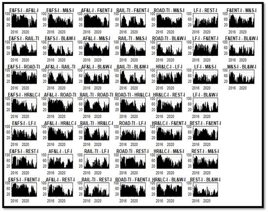 Table 3 displays a moderately positive link—a correlation coefficient of 0.465 between the E&FS-I sector and AF&L-I. On the other hand, there appears to be little correlation between BL&W-I and E&FS-I, as indicated by the correlation coefficient of only 0.224. The earliest indication of the assorted landscape of associations inside the Chinese economic system is given by these dissimilarities in the pairwise cross-market connections between the hospitality markets.