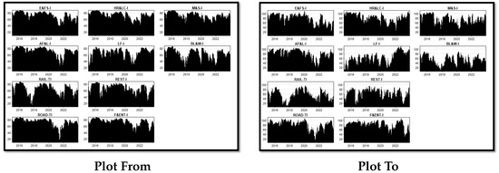 indicates that all information is available until , represents a vector with dimensions , and is a matrix of time-varying coefficients with dimensions and respectively, represents a lagged vector of dependent variables with dimensions , is a vector of error disturbances with dimensions , and is a time-varying variance–covariance matrix with dimensions . The parameter is dependent on their previous lag values of and the parameter indicates an error disturbance matrix with dimensions . The time-varying variance–covariance matrix has dimensions. Diebold and Yılmaz (2014) estimate the generalized connectedness procedure using time-varying coefficients and error covariances [2]. Koop et al. (1996) and Pesaran and Shin (1998) developed generalized impulse response functions (GIRFs) and generalized forecast error variance decompositions (GFEVDs) [54,55]. Converting the VAR model to its vector moving average (VMA) representation allows us to calculate the GIRF and GFEVD.