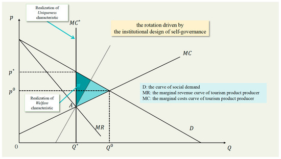 The mechanism of self-governance institution overcomes homogenization by promoting uniqueness and welfare characteristics of rural tourism products. Notes: According to the producer behavior pattern described by Varian (2020) [86], if a product producer can operate at point A, it indicates that the producer has obtained the right to set monopoly prices. This monopoly pricing power can be acquired in four ways: first, by expanding production scale to reduce production costs and achieve pricing power under natural monopoly; second, by extensively occupying key resources in agricultural production to form pricing power under resource monopoly; third, by obtaining exclusive protection through administrative orders to achieve pricing power under administrative monopoly; and fourth, by using the unique functions of the product to meet consumer demands and achieve pricing power through differentiation. Considering the current overall situation of rural areas in developing countries, first, it is unrealistic to achieve natural monopoly by expanding the production scale of rural tourism products in a short period of time. Second, as an economically disadvantaged area, it is also unlikely for rural tourism to obtain pricing power through resource monopoly at this stage. Third, under the various regulations of the WTO and the background of free trade in agricultural products worldwide, administrative monopoly pricing power is also difficult to achieve. Therefore, we believe that only by achieving pricing power through product differentiation and thereby realizing the strategy of differentiated competitiveness of rural tourism products is a feasible choice. In conclusion, the process by which rural tourism product producers seek to sustain their operations at point A is precisely the process by which they achieve monopolistic pricing power through the pursuit of product differentiation strategies, and this process is also the one that overcomes the homogeneity of tourism products.