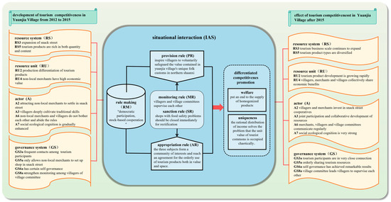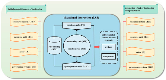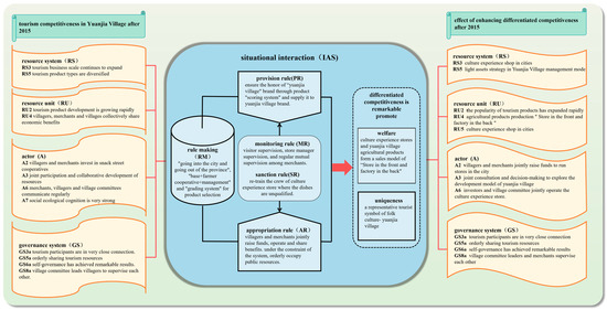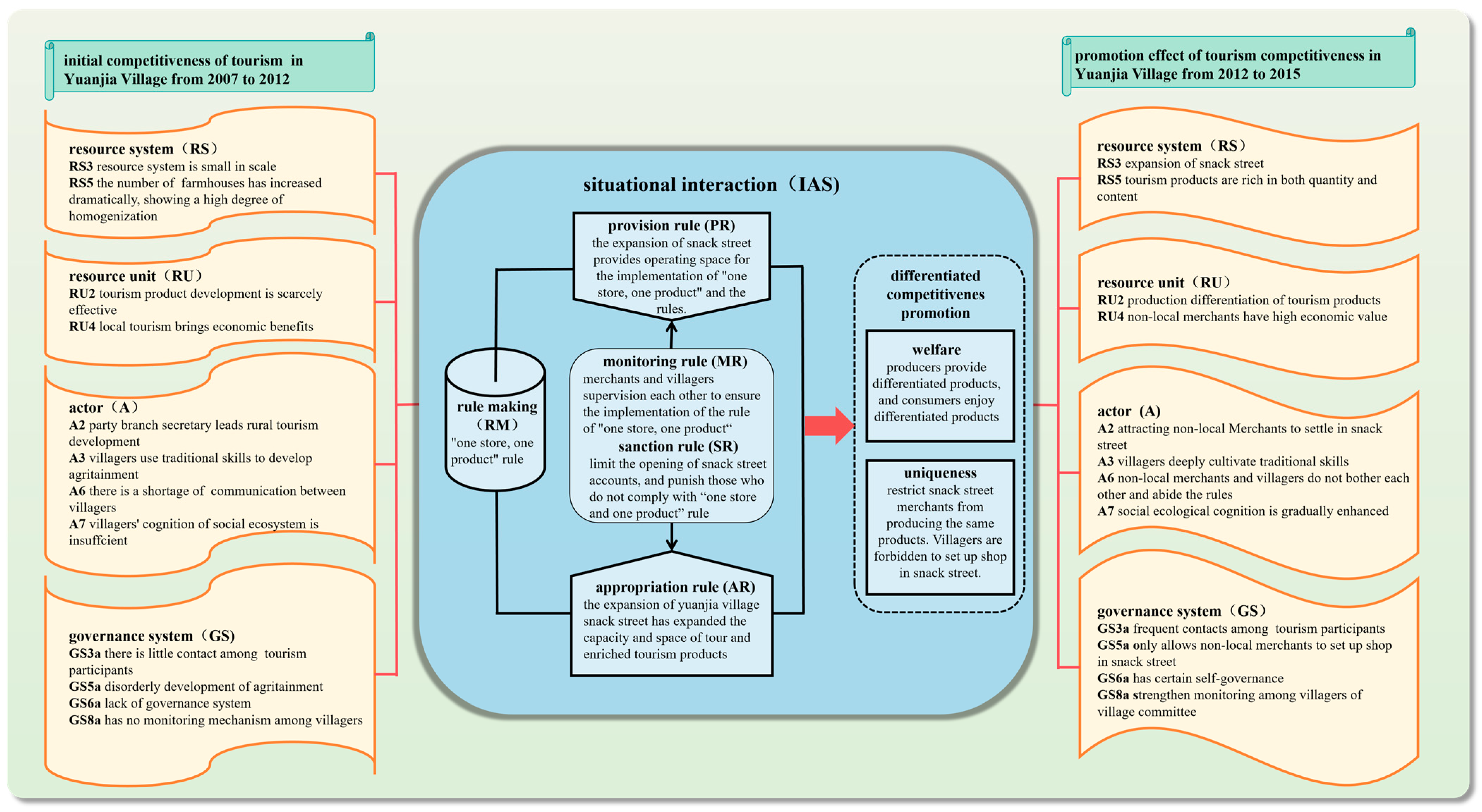 As can be seen from the preceding analysis, the four rules of provision, appropriation, monitor, and sanction contained within a self-governance institution promote the formation of welfare-oriented and unique differentiated competitiveness in rural tourism products. The process from institutional design of self-governance to continuous implementation of rules by people and, finally, to the formation of differentiated competitiveness occurs over a period of time. To analyze how self-governance institutions address the tragedy of the commons across different time periods, scholars specializing in institutional analysis have developed the combined Institutional Analysis and Development-Social Ecological Systems (IAD-SES) framework to deal with the scenario [90,91].