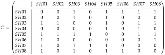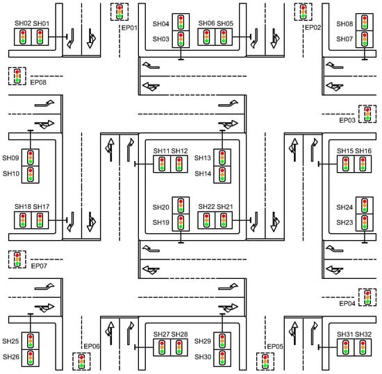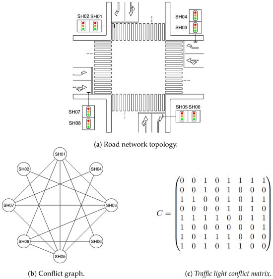 The final traffic light conflict matrix C was obtained using the adjacency relationships. Therefore, in the traffic light conflict matrix, SH01 will have conflicts (marked by 1) with SH03, SH05, SH06, SH07, and SH08.