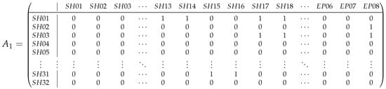 The adjacency matrix for this network is provided in the Supplementary Materials CSV Files, with the rows and columns corresponding to the real signal heads (SH01–SH32) and endpoint signal heads (EP01–EP08). The cells indicate the presence (1) or absence (0) of an adjacency relationship between the corresponding signal heads.