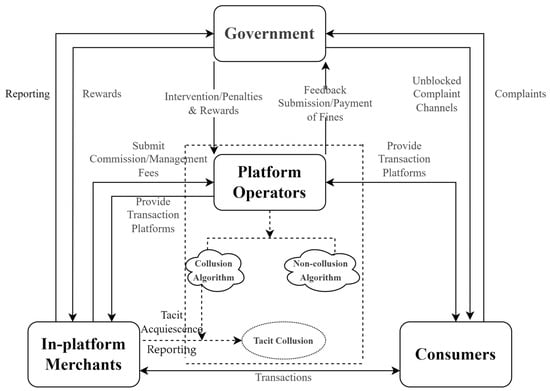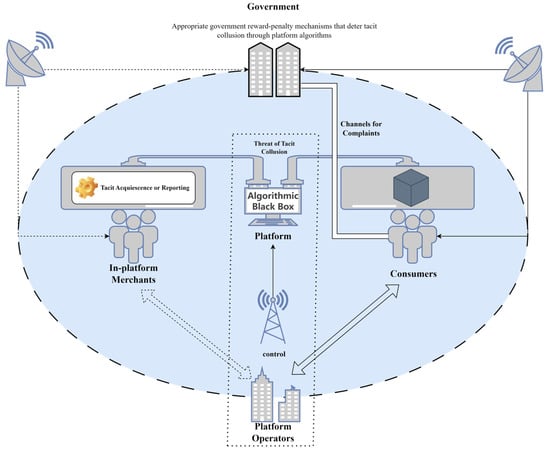 Algorithmic collusion can be primarily categorized into two distinct types: explicit collusion and tacit collusion. Explicit algorithmic collusion typically involves clear subjective intent among colluding parties, where market participants establish monopolistic agreements through explicit communication channels such as oral or written arrangements, with algorithms serving primarily as implementation tools for executing these collusive practices. Algorithmic tacit collusion primarily occurs in scenarios where market participants maintain their competitive positions through algorithmic interactions without explicit written or verbal agreements. Calvano [] and Cont et al. [] define algorithmic tacit collusion as a phenomenon wherein pricing algorithms with learning capabilities, when engaged in repeated market interactions, may converge on prices that deviate from competitive benchmarks. Such collusion can emerge from the decentralized interactions of autonomous algorithms that adapt to market data []. While tacit collusion may arise from the synergistic behavior of self-learning algorithms, it also encompasses the platform-driven dimension: algorithms are not merely static, embedded technical artifacts but are enmeshed in socio-technical systems, shaped by platform governance. Far from being neutral tools for users and workers, these algorithms actively reconfigure competitive dynamics in society []. Sanchez and Katsamakas [] further analyze managerial perspectives on algorithmic pricing in platform strategy, framing algorithm adoption as an endogenous strategic choice. Their work highlights how platforms balance multiple algorithms and how profits hinge on algorithmic design []. This paper thus examines how platforms’ algorithmic design or selection—even absent explicit coordination—can facilitate tacit collusion, with implications for market competition. Given platforms’ capacity to design operational rules, they can not only enhance their profitability and appropriate consumer surplus but can also develop and implement sophisticated monitoring mechanisms with minimal cost implications []. This advantage becomes particularly pronounced when platforms proactively collaborate with government regulators in formulating and executing comprehensive oversight mechanisms, thereby effectively mitigating the incidence of explicit algorithmic collusion among in-platform merchants []. Nevertheless, the inherent complexity and opacity of platform algorithms often hinder effective governmental oversight and intervention, potentially enabling platforms to exploit this regulatory gray zone for substantial market premium extraction []. In the absence of external regulatory intervention, in-platform merchants frequently demonstrate a propensity to acquiesce to algorithm-driven market dominance []. Consequently, the highly covert nature of platform-driven algorithmic tacit collusion makes it particularly challenging for consumers to discern the underlying manipulation mechanisms, thereby hindering the development of widespread social awareness and consumer vigilance regarding this issue. The government regulation of algorithmic tacit collusion in digital platforms (Figure 1) faces substantial challenges.