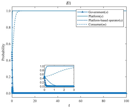 To better visualize the impact of critical factors on the evolutionary dynamics and outcomes within the multi-agent game system, numerical simulations were conducted using MATLAB R2023a. The simulation parameters were initialized with as the start time and as the end time, while all four game participants’ initial strategy probabilities were set at 0.5 (the uniform initialization of strategy probabilities at 0.5 for all agents serves dual methodological purposes: First, this symmetric initialization eliminates prior strategy biases, ensuring all emergent outcomes are purely driven by the payoff structure and game-theoretic dynamics. Second, while real-world agents may exhibit asymmetric behavioral predispositions, the simulation framework (available upon request) permits examination of alternative initial distributions. This modeling choice strictly ensures observed results reflect the game’s inherent properties rather than initialization artifacts.). Three distinct parameter sets were configured to satisfy the equilibrium conditions outlined in the corollaries, thereby validating the equilibrium analysis. The first parameter configuration, satisfying conditions , , and , is as follows: