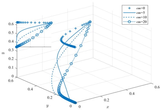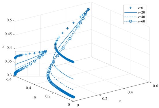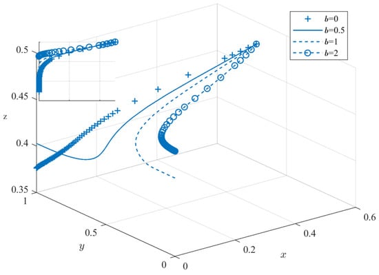(). The corresponding simulation results, presented in Figure 4, demonstrate convergence to equilibrium state . Subsequently, parameters were configured according to equilibrium conditions , and : (), with the simulation outcomes illustrated in Figure 5 showing convergence to equilibrium state . All three parameter configurations yielded simulation results consistent with the theoretical analysis derived from the corollaries.