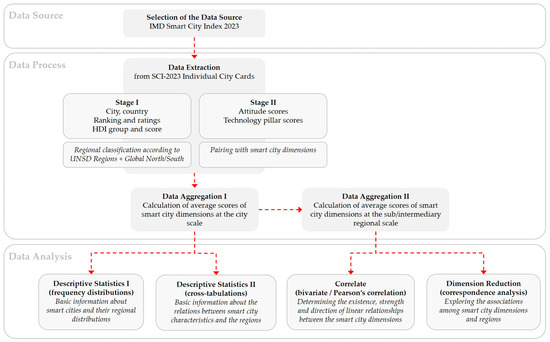 A multi-step research strategy was employed to fulfil the study’s objective and to answer the research questions, encompassing (1) the identification of an appropriate data source, (2) methodical data extraction and aggregation, and (3) statistical data analyses. As illustrated in the methodology flowchart (Figure 1), the research began with the selection of the data source as the IMD Smart City Index 2023, followed by a two-stage data extraction process from records at the city scale. Relevant indicators were then grouped into six smart city dimensions, and average scores were calculated for each city and sub/intermediary region. Descriptive statistics and correlation and correspondence analyses were then applied to explore the differentiations between and associations among regions and smart city dimensions. Visualisation tools facilitated both statistical and geographic representations of the findings.