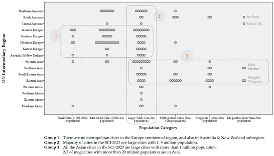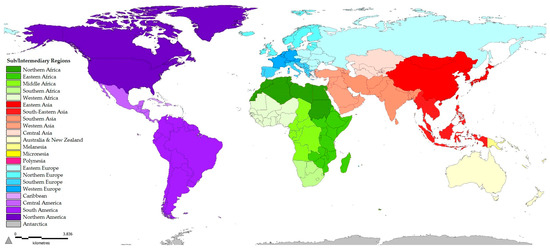 This study compiled a structured database from individual city cards in the SCI-2023 for the data analysis. Cities listed in the SCI-2023 were coded with their respective countries and regions. Regions were classified according to the Standard Country or Area Codes for Statistical Use (M49) [61] by the UNSD “… based on continental regions; which are further subdivided into sub-regions and intermediary regions drawn as to obtain greater homogeneity in sizes of population, demographic circumstances and accuracy of demographic statistics” [61]. The scale for the analyses was determined to include the sub/intermediary regions (Figure 2). Additionally, regional classifications were refined to reflect the Global North–South divide based on the information from the United Nations Educational, Scientific and Cultural Organization (UNESCO), Organization for Women in Science for the Developing World [81]. Cities were also classified according to their populations. Population groups were obtained from the Size Class of Urban Agglomeration by the United Nations Human Settlements Programme (UN-Habitat) [82] and reclassified for the data analysis. Selected economic, social, and technological indicators of sub/intermediary regions were obtained from UNdata database [83] and the UNSD world statistics [84], enabling further discussions on the role of different factors in the regional differentiation of smart cities.