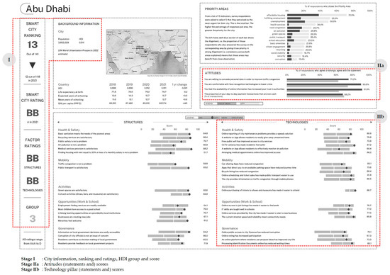 The SCI-2023 presents individual city cards, including basic information, survey results, and findings regarding the ranking and rating levels (Figure A1). Cities are categorised into four groups based on the Global Data Lab’s Human Development Index (HDI) [79], which “… is a summary measure of average achievement in key dimensions of human development: a long and healthy life, being knowledgeable and having a decent standard of living” [80]. A rating scale (from AAA to D) is assigned within each HDI category based on the perception scores compared to group averages (Figure A2). Rankings are presented in two formats: (1) as a smart city ranking, from 1st to 141st in the SCI-2023, and (2) with a rating for each pillar and an overall smart city rating.