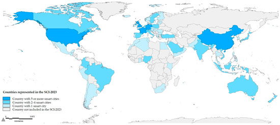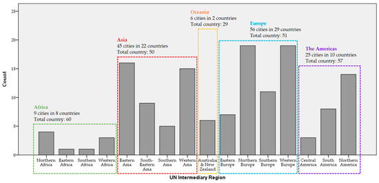 The cities listed in the SCI-2023—a total of 141 cities—are located in 71 different countries all over the world (Figure 4), which reveals the capacity of the SCI-2023 to conduct research in the global context. The majority of the countries have only one city in the SCI-2023, whereas 35% of them have more than two cities (Figure 5). Considering the population sizes and coverage areas of the countries, the SCI-2023 represents specific countries with more than one city, such as China, the United States, the United Kingdom, and Germany. The SCI-2023 also reflects a strong representative level in terms of global regions. Out of the 71 countries, 38 are in the Global North, which is home to 83 smart cities, while the 33 countries in the Global South host 58 smart cities (Table A3). The SCI-2023 includes cities from all UNSD continental regions; however, 6 out of the 22 sub/intermediary regions are not represented: Middle Africa and Central Asia, as inland intermediary regions of the Sub-Saharan Africa subregion, and the Caribbean, Melanesia, Micronesia, and Polynesia, as small island subregions of Oceania.