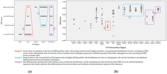 Geographical distribution of cities in the SCI-2023 according to (a) the HDI groups in the continental regions; (b) HDI scores in the sub/intermediary regions.