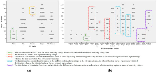 Geographical distribution of cities in the SCI-2023 according to smart city rating (a) in the continental regions and (b) in the sub/intermediary regions.