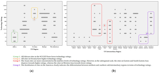 Geographical distribution of cities in the SCI-2023 according to technology rating (a) in the continental regions and (b) in the sub/intermediary regions.
