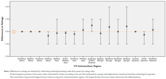 In smart city literature, technology is stated to be the main driver of smart cities; therefore, similar patterns are expected to be observed between the smart city and technology ratings. Examining the mean values of the differences between the smart city and technology ratings indicates the higher capacity of specific sub/intermediary regions, namely Northern and Western Europe and Australia & New Zealand, to translate their technological capacities into smartness levels (Figure 11, Table A6). On the contrary, all Asian subregions, along with the South America and Eastern Europe sub/intermediary regions, present negative mean values, which means that they have lower smartness levels with regard to their technological capacities.