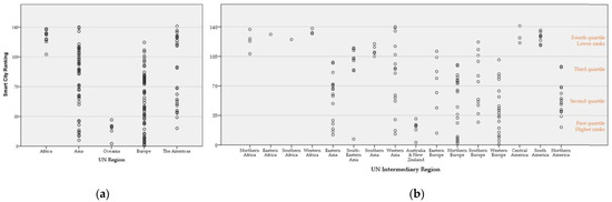 The distribution of smart city rankings indicates a balanced representation in Asia and Europe (Figure 12a,b). Both continental regions feature smart cities that are categorised into distinct ranking groups; however, European smart cities are predominantly found in the first quartile, while Asian cities are primarily located in the middle of the ranking list. Asia encompasses the cities ranked highest as well as those ranked the lowest; however, only a limited number of cities were found in the top ten or top twenty lists (Table A7). Europe exhibits a diverse range of smart cities, with nearly one-fourth of them positioned within the top 20 rankings. This suggests a relatively uniform level of development throughout Europe, especially when compared to Asia. The northern and southern differentiation is again evident in the Americas. Cities in the Northern America subregion predominantly occupy the upper half of the ranking list, while those in the Latin America & the Caribbean subregion are primarily found in the lower half. Nearly all African cities are positioned at the lower end of the rankings, with eight out of nine cities falling within the bottom 20. In contrast, cities in Oceania occupy the top positions, with all of them placed in the first quarter of the ranking list.