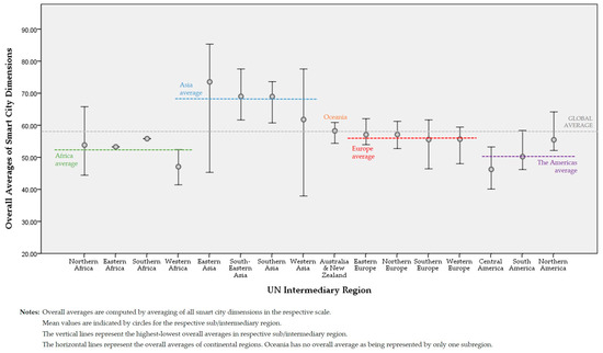 An evaluation of sub/intermediary regions in relation to the overall average smart city dimensions (Figure 13) indicates that Europe exhibits a similar clustering of subregions around the overall regional average, which closely aligns with the global average. Oceania is represented in only one subregion, and its overall average is comparable to the global average. Nonetheless, sub/intermediary regional differentiations are evident in other regions. Southern Africa exhibits a lower overall average compared to the overall average for Africa, while Northern Africa surpasses this average. Comparable outcomes are observed in the sub/intermediary regions of the Americas, characterised by a distinct northern and southern differentiation. The dominance of Asian smart cities is evident when evaluating the overall average of smart city dimensions. Asian subregions exhibit the highest overall averages, surpassing the global average and that of all other subregions, with Eastern Asia at the forefront, whereas Western Asia exhibits lower overall averages compared to other subregions in Asia.