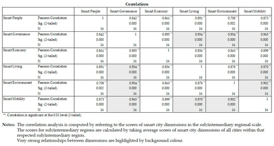 The correlation matrix between smart city dimensions at the sub/intermediary scale—very significant relationships (r ≥ 0.900) for each dimension are highlighted by background colour.