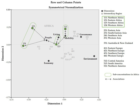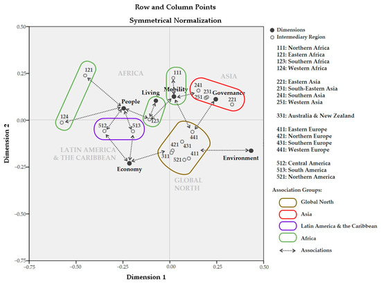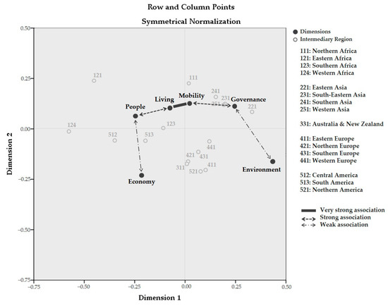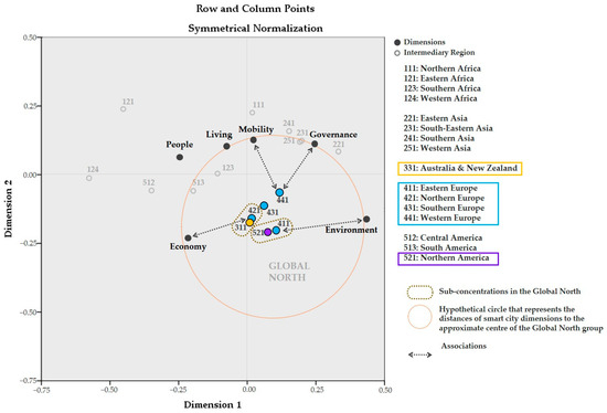 To respond to the third research question—Which associations exist among smart city dimensions and regions?—and to further evaluate the results obtained by the correlation analysis, a correspondence analysis was employed. As a type of multivariate statistics, the correspondence analysis breaks down contingency tables into their constituent parts [87] to represent different levels of variation across the rows and columns [88]. It can be considered a mapping technique that concurrently visualises the associations between the rows and columns of cross-tabulations [89]. Graphical representations of cross-tabular data, namely correspondence maps, constitute a form of data description via visualisation. These maps facilitate the swift analysis of the associations embedded in the data, as the proximity of the points on these maps indicates strong associations [90,91,92]. Correspondence analysis offers several advantages as a statistical technique. Unlike conventional statistical methods, it does not require any assumptions about the underlying distributions of the data, making it a versatile tool for various types of analysis [91]. Additionally, it is highly flexible and can be applied to any kind of cross-tabulation, allowing for researchers to effectively explore the associations between variables [91]. Moreover, unlike other multidimensional scaling techniques, correspondence analyses are suitable for categorical and qualitative data, preserving the distributional characteristics of the initial variables while investigating associations [93]. This multivariate technique enabled this study to visualise the associations among smart city dimensions and sub/intermediary regions and to capture both strong and weak associations, allowing for the identification of associations based on the proximity on the correspondence map.