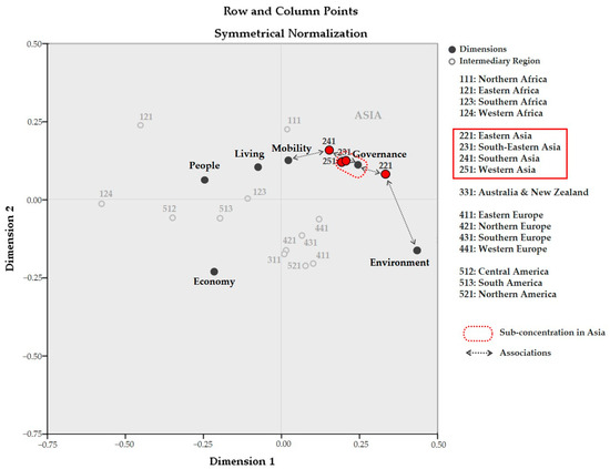 Another significant concentration was observed among the Asian subregions, but this differed to the Global North concentration, being mainly linked to a singular smart city dimension, namely, smart governance (Figure 18). Considering that the degrees of these associations vary according to the positions of the subregions on the correspondence map, the South-Eastern and Western Asia subregions have similar characteristics, as they nearly overlap on the correspondence map, and both demonstrate very strong associations with the smart governance dimension. Nonetheless, these associations are comparatively weaker for the Eastern and Southern Asia subregions. Southern Asia exhibits a weak association with the smart mobility dimension, whereas Eastern Asia demonstrates a weak association with the smart environment dimension. These diverse associations and different positions of the Eastern and Western Asia subregions are parallel with the findings of the descriptive statistics, demonstrating the regional differentiations within Asia, and the west and east differentiation.