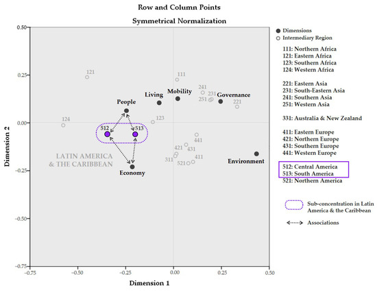 A notable concentration can be seen among the intermediary regions of Latin America & the Caribbean subregion of the Americas (Figure 19). These intermediary regions, namely Central and South America, are strongly associated with the smart people and smart economy dimensions. Given that these regions exhibit comparable distances from these dimensions on the correspondence map, the levels of association are thus similar. The regional differentiation indicated by the descriptive statistics regarding the northern and southern differentiation in the Americas is also evident in this analysis. The Northern America subregion, which aligns with the European subregions and Australia & New Zealand on the correspondence map, features associations that are markedly different from those of the Latin America & the Caribbean subregion.