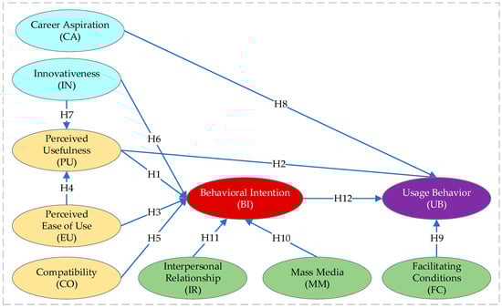 Among these, Innovativeness represents teachers’ openness to new ideas and technologies. Numerous studies have identified Innovativeness as a key influencing factor [,]. In this paper, Innovativeness reflects teachers’ attitudes and may significantly impact their perceptions of the usefulness of AI technologies. Thus, we propose two hypotheses: