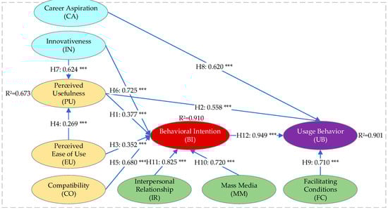 In addition, R-squared values describe the relationship between exogenous variables (e.g., Perceived Usefulness) and endogenous variables (e.g., Behavioral Intention), that is, the degree to which the exogenous variables explain the variance of the endogenous variables. In Figure 2, Innovativeness and Perceived Ease of Use together accounted for 67.3% of the variance in Perceived Usefulness. The collective impact of Perceived Usefulness, Innovativeness, Perceived Ease of Use, Compatibility, Interpersonal Relationship, and Mass Media accounted for 91.0% of the variance in Behavioral Intention. Behavioral Intention, Perceived Usefulness, and Career Aspiration accounted for 90.1% of the variance in Usage Behavior. Compared with other variables, Perceived Usefulness had the least explained variance, at 67.3%, which implies that there may be other factors influencing Perceived Usefulness.