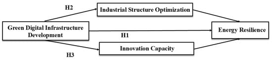 Industrial structure theory suggests that the advancement, rationalization, and low-carbon transformation of industrial structure are important indicators of high-quality economic development and key pathways to enhancing energy system resilience [30]. As an important component of new infrastructure, green digital infrastructure promotes industrial structure evolution toward a more low-carbon and efficient direction by digitally empowering traditional industries and fostering emerging industries. Green digital infrastructure not only reduces information acquisition and transaction costs, promoting optimal resource allocation across industries [31], but also improves energy utilization efficiency across various sectors through intelligent control and refined management. From an industrial ecology perspective, green digital infrastructure promotes upstream and downstream collaboration in industrial chains and cross-industry integration, enhancing the industrial system’s shock resistance [32]. Dynamic capability theory suggests that organizations respond to environmental changes by integrating, building, and reconfiguring internal and external resources, with green digital infrastructure serving as an important tool for enhancing this dynamic capability [33]. Through the optimization and adjustment of industrial structure, the energy system’s supply structure becomes more diversified, the demand structure becomes more rational, and the market structure becomes more perfected, thus exhibiting stronger resilience when facing external shocks. The structure–conduct–performance paradigm also supports this view, suggesting that industrial structure changes driven by green digitalization lead to behavioral pattern transformations, ultimately improving overall system performance, including enhanced resilience. Based on this, this study proposes the second research hypothesis: