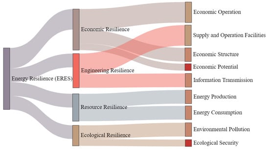 Energy resilience research also covers multiple levels and dimensions. He et al. (2019) proposed a multi-regional input–output linear programming model to study the energy resilience of multi-regional economies that considers sectoral and inter-regional dependencies in economic structures and can calculate the impact of random energy production disruptions on the entire multi-regional input–output system [23]. Li and Zhang (2023), based on a grey correlation projection model, conducted spatiotemporal measurements of energy resilience in 30 Chinese provinces, finding that the spatiotemporal pattern of China’s energy resilience underwent significant changes from 2005 to 2018, with energy endowment being the primary condition for ensuring regional energy resilience, while renewable energy development, energy investment, economic development, and policy coordination played crucial roles in ensuring regional energy resilience [24]. Sharmin and Dhakal (2022) developed a “composite energy resilience index” for Bangladesh containing 15 individual indicators, emphasizing that energy resilience critically depends on a range of affordability, sustainability, and availability issues, as well as aspects of energy system management quality [25].