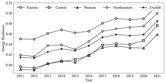 Figure 3 illustrates the overall trend of China’s energy resilience from 2011 to 2021, as well as the evolution of energy resilience in the eastern, central, western, and northeastern regions. Overall, China’s energy resilience has shown a steady upward trend, rising from 0.415 in 2011 to 0.485 in 2021, an increase of 16.9%. From a regional perspective, the eastern region has consistently maintained a leading position in energy resilience, rising from 0.450 in 2011 to 0.514 in 2021, an increase of 14.2%; the central region’s energy resilience rose from 0.396 to 0.476, an increase of 20.2%, which is the largest growth; the western region’s energy resilience rose from 0.391 to 0.459, an increase of 17.4%; and the northeastern region’s energy resilience rose from 0.419 to 0.499, an increase of 19.1%. In terms of regional differences, the gap in energy resilience between the eastern region and other regions reached its maximum in 2014–2015 and has since narrowed, indicating a certain effectiveness of regional coordinated development strategies in the field of energy resilience. Notably, after 2016, the growth rate of energy resilience in various regions accelerated significantly, which may have a certain correlation with the implementation of the green data center pilot policy in 2015, providing preliminary evidence for the subsequent empirical analysis.