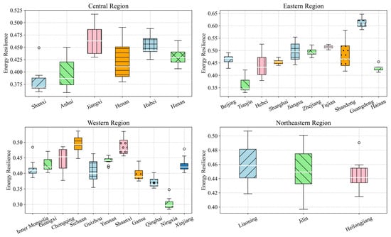 Figure 4 further illustrates the changes in energy resilience across provinces. As can be seen from the figure, Guangdong Province has the highest level of energy resilience, with a median of 0.607 and relatively small fluctuations, and eastern coastal provinces such as Jiangsu, Fujian, and Zhejiang also have relatively high levels of energy resilience, while western regions such as Ningxia, Qinghai, and Gansu have relatively low levels of energy resilience. These regional differences are closely related to each region’s level of economic development, industrial structure, resource endowment, and ecological environment conditions. Notably, western regions such as Chongqing, Sichuan, and Shaanxi have relatively high levels of energy resilience, which may be related to these regions’ increased investment in energy infrastructure, optimization of energy structure, and active promotion of digital transformation in recent years. At the same time, some provinces such as Hebei and Shandong have experienced rapid growth in energy resilience, with large differences between maximum and minimum values, indicating significant improvements in energy resilience in these regions during the sample period.