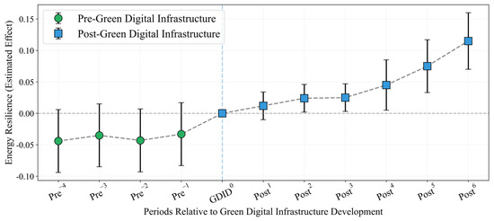 To test the impact of green digital infrastructure development on energy resilience, this study conducts empirical analysis using a difference-in-differences model, with the benchmark regression results reported in Table 3. Column (1) only controls for regional fixed effects and time fixed effects, while column (2) adds control variables on this basis. In model (1), the coefficient of green digital infrastructure development (GDID) is 0.0137, significant at the 5% level, indicating that the green data center pilot policy can significantly enhance regional energy resilience levels without considering other control variables. After controlling for relevant factors, the coefficient of GDID in model (2) becomes 0.0125, still significant at the 5% level, further verifying that the positive impact of green digital infrastructure development on energy resilience is statistically robust. Specifically, the green data center pilot policy can increase the regional energy resilience index by approximately 0.0125 units on average, which represents an improvement of about 2.83% compared to the sample mean of 0.4419, having significant economic implications. This result supports the core hypothesis of this study, namely that the development of green digital infrastructure can enhance regional energy systems’ resilience capabilities, promoting the ability of energy systems to maintain stable operation and quickly recover when facing external shocks. These benchmark results provide strong support for Hypothesis 1, confirming that green digital infrastructure development has a positive impact on energy resilience. The significant coefficient of GDID across model specifications demonstrates that this positive relationship persists even after controlling for relevant economic and social factors.