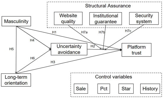 As far as we know, few studies are concerned with trust issues in terms of individual sellers. Such sellers operate on a smaller scale and have absolute freedom to decide whether to remain on the platform depending on their own feelings, which gives us the opportunity to examine platform trust from a cultural perspective at the individual seller level []. On the other hand, many studies based on Hofstede’s cultural dimensions have ignored the influence of other factors on this relationship and the correlation between cultural dimensions, which our study remedies.