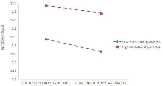 Institutional guarantee moderates the relationship between uncertainty avoidance and platform trust, such that strong institutional guarantee weakens the negative relationship.
