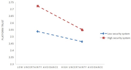 Security system moderates the relationship between uncertainty avoidance and platform trust, such that strong security system weakens the negative relationship.