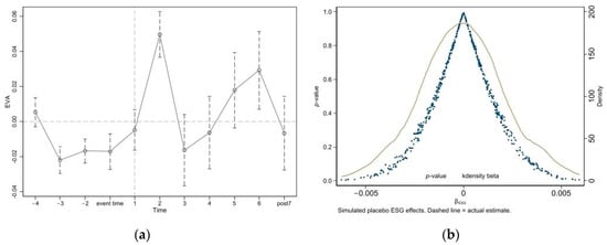 ESG Effects on EVA and robustness. The left panel (a): Parallel trend test. The right panel (b): Placebo test.
