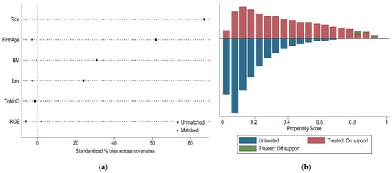 The PSM-DID analysis addresses potential biases and enhances causal inference between ESG performance and shareholder value. It combines Propensity Score Matching and difference-in-differences to provide more accurate estimates by controlling for observable and unobservable confounders [45]. Figure 3a shows a substantial reduction in bias across covariates after matching, indicating a well-balanced sample and improving comparability between the treated and control groups. This reduction is critical for ensuring the subsequent analysis is based on comparable samples. Figure 3b shows a significant overlap in propensity scores between treated and untreated groups, confirming successful matching—an essential assumption for PSM-DID validity. Table 4, Column (1) presents the findings from the PSM-DID regression analysis. The DID coefficient for EVA in Column (1) is positive and significant (0.158 ***), indicating that ESG performance enhances shareholder value. The ESG coefficient in Column (2) is also positive and significant (0.022 ***), confirming the reliability of these findings across different models. These results support H1 and further bolster H2 as ESG’s positive effect on shareholder value is confirmed through multiple methodologies.