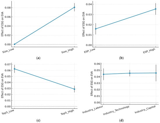 Panel (c) compares firms with high versus low ownership concentration. The ESG coefficient is more significant in the low-concentration group (β = 0.063 vs. 0.029), consistent with the hypothesis that ESG acts as a complementary governance mechanism in settings with dispersed ownership. Panel (d) reports industry-specific effects. ESG performance is positively associated with EVA across labor-intensive (β = 0.044, ***), capital-intensive (β = 0.046, ***), and technology-intensive (β = 0.046, ***) sectors. The slightly higher coefficients in capital- and tech-intensive firms may reflect the operational risk mitigation and innovation signaling roles of ESG in these contexts. In contrast, the benefits in labor-intensive industries are likely tied to social compliance and workforce management.