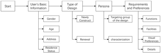 As shown in Figure 2, The module is primarily responsible for collecting and interacting with users during the initial stages of needs gathering [34]. The module incorporates a sophisticated set of prompt engineering strategies based on ChatGPT 4′s multiturn conversational capabilities to ensure a comprehensive capture of user needs. A library of pre-designed conversation templates and guidance scripts was developed under the CO-STAR framework [35]. These templates include clearly defined conversational trees that guide users through multiple stages—from basic demographic data collection to detailed spatial feature specification. By programmatically refining typical designer research workflows—such as interview steps and needs assessments—into interactive prompts, it constructs a tree-structured research workflow (see Figure 3). Specifically, once a user initiates a conversation, the system first collects basic residential information, including gender, age, location, and living conditions. To ensure user privacy, the system employs an anonymization process where user identities are decoupled from their responses. During the initial interaction, no sensitive personally identifiable information is recorded. Instead, each user is assigned a randomly generated user ID, which is used throughout the data collection process for consistency and verification to guarantee that all stored data remains anonymized and that privacy is maintained throughout the system’s operation. Next, it identifies whether the targeted public cultural space is a new project or a renovation. It then guides the user in describing the demographic profile of potential users (i.e., community groups and their characteristics). Finally, it prompts a discussion of detailed spatial features to collect more granular needs data. Throughout, residents are encouraged to express their usage habits, improvement suggestions, and anticipated design requirements for the public cultural space, while the system saves unstructured needs data from these conversations as semi-structured information.