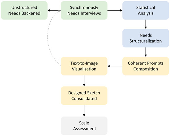 In particular, traditional face-to-face consultations and surveys struggle to cover the needs of various age groups or more vulnerable populations, further constraining the overall impact of participatory processes [29]. Meanwhile, although older communities may possess abundant idle spaces, resident knowledge, and cultural resources, they lack effective mechanisms for developing and integrating these resources, limiting the potential for sustained community revitalization [30]. The swift evolution of generative AI is ushering in unprecedented modes of human–AI co-creation, empowering professionals to enrich their creative workflows. Gmeiner et al. [31] developed an evidence-based workflow that leverages learning-science principles to design and rigorously evaluate interface supports that help professionals acquire conceptual and procedural skills for effective human–AI co-creation with generative AI systems. Ford and Bryan-Kinns [32] surveyed 122 music-focused AI co-creation systems and propose that, instead of merely lowering technical barriers, design should foreground “reflection-oriented” interfaces—such as latent-space visualizations and suggestive cross-genre prompts—to help novices critically examine and evolve their creative intentions while collaborating with generative models. Zamfirescu-Pereira et al. [33] introduced BotDesigner, a no-code iterative workflow that enables non-AI experts to co-create instructional chatbots with GPT-3 via prompt engineering, demonstrating how generative dynamic workflows can democratize human-AI co-creation in real-world design scenarios.