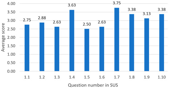 The average total score of the SUS scale for this experiment was 76.56, placing the system in the “Good” range for usability according to the SUS scoring criteria—indicating positive user perceptions regarding ease of use, functional integration, and overall satisfaction. To provide a more detailed look into how each individual item contributed to this overall rating, Figure 7 presents the average score per question on the SUS scale. On the x-axis, each item (1.1 through 1.10) corresponds to a specific dimension of usability (e.g., complexity, learnability, confidence), and the y-axis indicates the mean rating assigned by subjects, ranging from 1 (strongly disagree) to 5 (strongly agree).