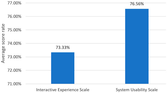 Comparing the average scores from both the SUS (76.56%) and the Interactive Experience Scale (73.33%) shown in Figure 8, the x-axis identifies which scale is being measured (Usability vs. Interactive Experience), while the y-axis indicates the mean percentage score achieved by each scale. This difference suggests that, although participants generally found the Community Public Cultural Space Co-creation System user-friendly (i.e., high usability), there is slightly more room for improvement in areas related to interactive engagement. Users generally hold high expectations for the system’s visualization of design needs while also suggesting improvements regarding the integration of system functionality, technical learning curve, and precise needs-to-design-image matching.