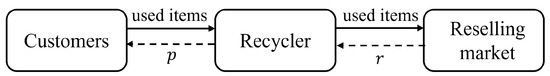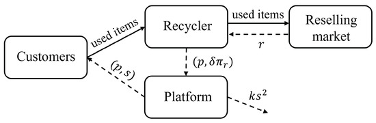 We consider a recycling market consisting of a monopolistic recycler, a platform, and customers who need to dispose of used items. Prior to the emergence of the platform, the recycler directly collected used items from customers at a unit acquisition price p, processed them, and resold the output either as a commodity or raw material in the reselling market, generating revenue based on the average residual value r per unit of used items, as illustrated in Figure 1. The unit average residual value represents the net value after accounting for the unit cost incurred by the recycler for processing each unit of recyclables, including collection and refurbishment fees. When the platform emerges, if the recycler cooperates with the platform, he will offer the acquisition price p for the customer through the platform, and the customer’s used items are collected directly by the recycler, as shown in Figure 2. Furthermore, the recycler is required to pay a commission fee to the platform, and the platform will make an innovation effort s which can increase customers’ utility.