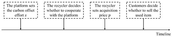 In recent years, platforms have increasingly penetrated various sectors. The impact of their entry on incumbents has consistently intrigued scholars. Sharma and Mehra (2021) [28] examine the impact of platform entry into the market when the platform’s ad revenue depends on the accessed product’s quality. Gal-Or and Shi (2022) [29] and Deng et al. (2023) [30] delve into the effects of platform entry on incumbent competitive dynamics and their responsive strategies. He et al. (2020) [31] employ data from a Chinese e-commerce platform to scrutinize the entry strategy determination through seller competitiveness and exclusivity considerations. Dhanorkar (2019) [32] highlights the role of online matching platforms such as Craigslist, FreeCycle, and Gumtree in promoting product reuse by reducing reliance on traditional recycling and disposal methods. Guan et al. (2023) [33] explore how manufacturers respond to the entry of third-party platforms and how they can build their own platforms in response. Additionally, empirical studies by Burtch et al. (2018) [34], Foerderer et al. (2018) [35], and Liu et al. (2023) [36] have explored the impact of platform entry into new industries. However, the literature also indicates that the entry of platforms into new industries does not always guarantee positive outcomes [37,38]. Given the considerable amount of research centered on platform entry into emerging industries, our aim is to offer a distinctive perspective by investigating platform entry into the recycling market. By delving into this specific context, we seek to contribute to the current research on platform entry strategies, shedding light on the dynamics, challenges, and potential outcomes associated with their engagement in the recycling business.