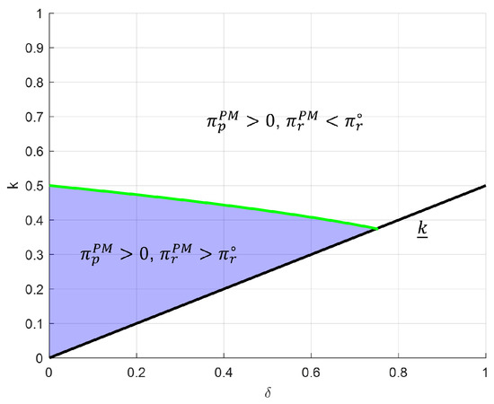 The feasible region derived in Proposition 1 is illustrated in Figure 4. Specifically, when the commission rate is moderate () and the cost of sustainable innovation is below the threshold (), corresponding to the area below the green line in Figure 4, the profit-oriented platform can successfully establish cooperation with the monopolistic recycler and thereby enter the recycling market. In this scenario, the platform’s investment in sustainability initiatives incentivizes greater customer participation in recycling, resulting in an overall increase in recycling volume. Consequently, augmented consumer surplus improves, environmental benefits increase, and social welfare is enhanced, ultimately fostering a “win-win” outcome where all parties—the platform, recycler, and customers—benefit from the cooperation.
