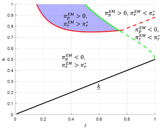 Proposition 3 establishes that the entry conditions for profit-oriented and ESG-driven platforms are mutually exclusive. In other words, achieving a “win-win” outcome in the recycling market requires a profit-oriented platform to focus on low-cost sustainable innovation (i.e., ), whereas an ESG-driven platform must prioritize high-cost sustainable innovation (i.e., ). This distinction highlights their inherently different strategic approaches to sustainability and market participation.