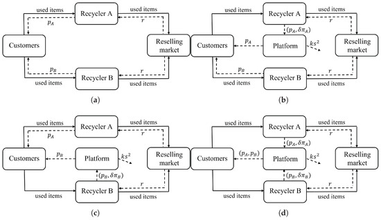 Recycling models in a duopolistic market. (a) Recycling by competing recyclers. (b) Cooperative recycling between platform and Recycler A. (c) Cooperative recycling between platform and Recycler B. (d) Cooperative recycling between platform and two recyclers.