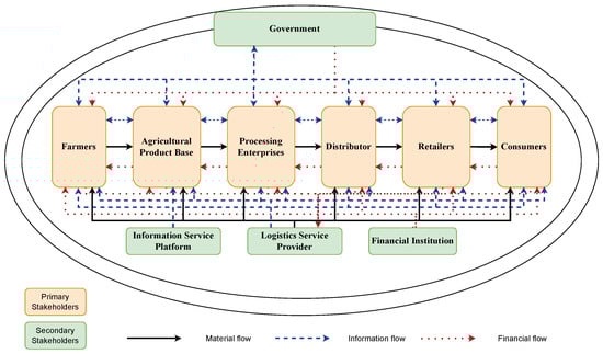 Based on stakeholder theory, AFSC participants can be categorized into two groups: primary stakeholders, who directly participate in agri-food circulation and derive economic benefits (such as farmers, production bases, processing enterprises, distributors, and retailers), and secondary stakeholders, who are indirectly involved (such as government agencies, logistics service providers, ISPs, and financial institutions). The latter influence the AFSC’s core operations by regulating material, information, and financial flows. Figure 1 presents a general structural diagram of the AFSC, clearly distinguishing between primary and secondary stakeholders, and using arrows to indicate collaborative relationships and resource flow pathways among them.