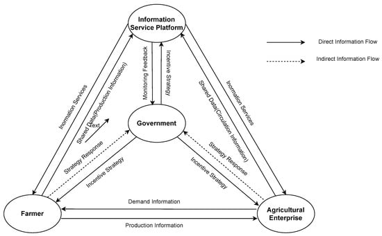 In this section, we design a quadripartite evolutionary game model for information collaboration in the AFSC. This study focuses on the strategy choices, interactive mechanisms, and evolutionary trajectories of various stakeholders. Based on the previous literature review, we direct participants in information collaboration, farmers, agri-food enterprises (AFEs), an information service platform (ISP), and the government as game agents of the model. The term “agri-food enterprises” refers to a collective designation for intermediary enterprises positioned between the farmers and consumers within AFSCs, including processing enterprise, distributor, and retailer. The structure of the information collaboration in AFSCs is illustrated in Figure 2.