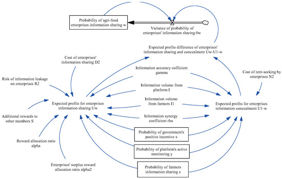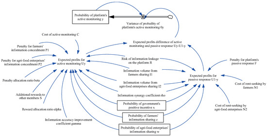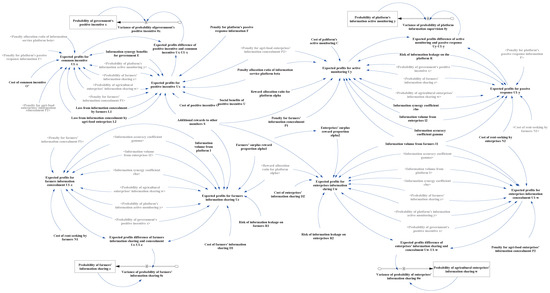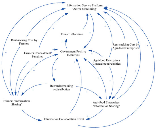 By mapping the causal relationships and feedback mechanisms among the four stakeholders in the evolutionary game, we developed a causal loop diagram of the information collaboration system within the AFSC, as illustrated in Figure 4. To intuitively depict the internal feedback structure and inter-variable relationships, arrows are used to indicate the direction of causality between variables, while plus (+) and minus (−) signs represent positive and negative feedback loops, respectively.
